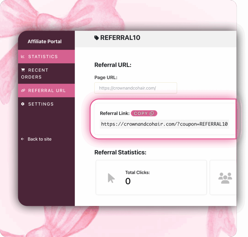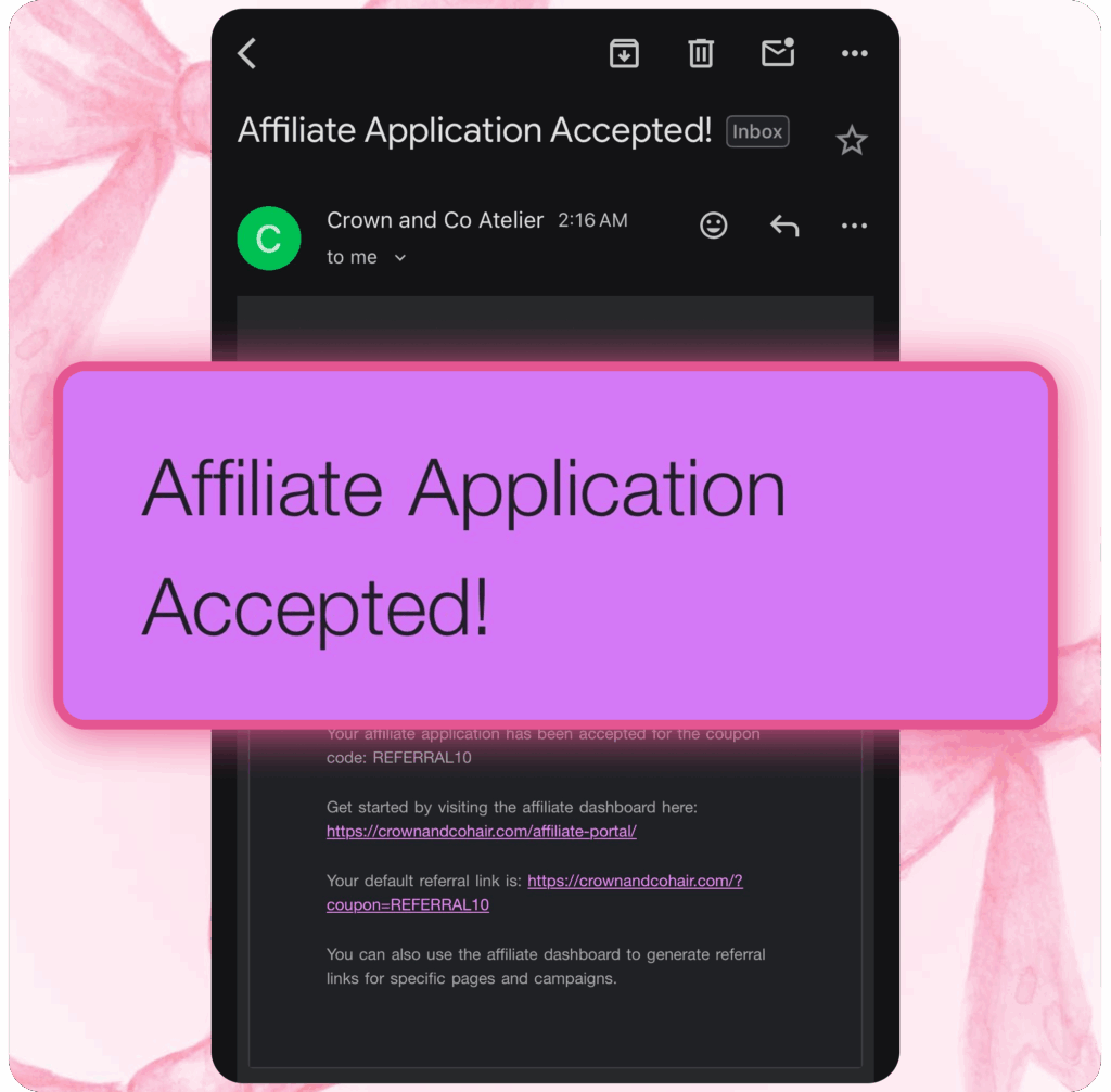 CROWN AND CO ATELIER X SKYNBLOOM Welcome to Our Affiliate ProgramFriends who refer together save together: Unlock Our Referral Loyalty exclusive 10% Discounts On Crowned Wigs and Body Care Get Started JOIN OUR AFFILIATE PROGRAM IN 3 EASY STEPS How it works STEP 1: Register Your Affiliate Account with us and wait for your approval STEP 2: Check Your Email To See if you have been accepted STEP 3: Login to your dashboard to get your referral link and track your referrals Get Started
